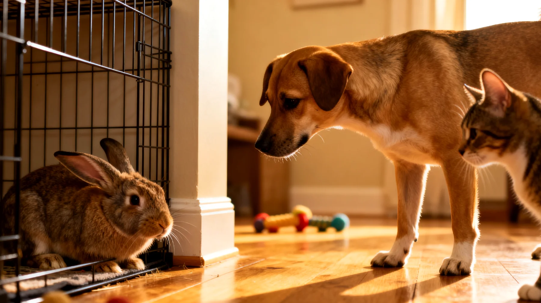 - Auslaufzeiten staffeln: Lassen Sie Ihr Kaninchen in einem Raum frei laufen, während Hund und Katze im Garten sind oder in einem anderen Stockwerk spielen.