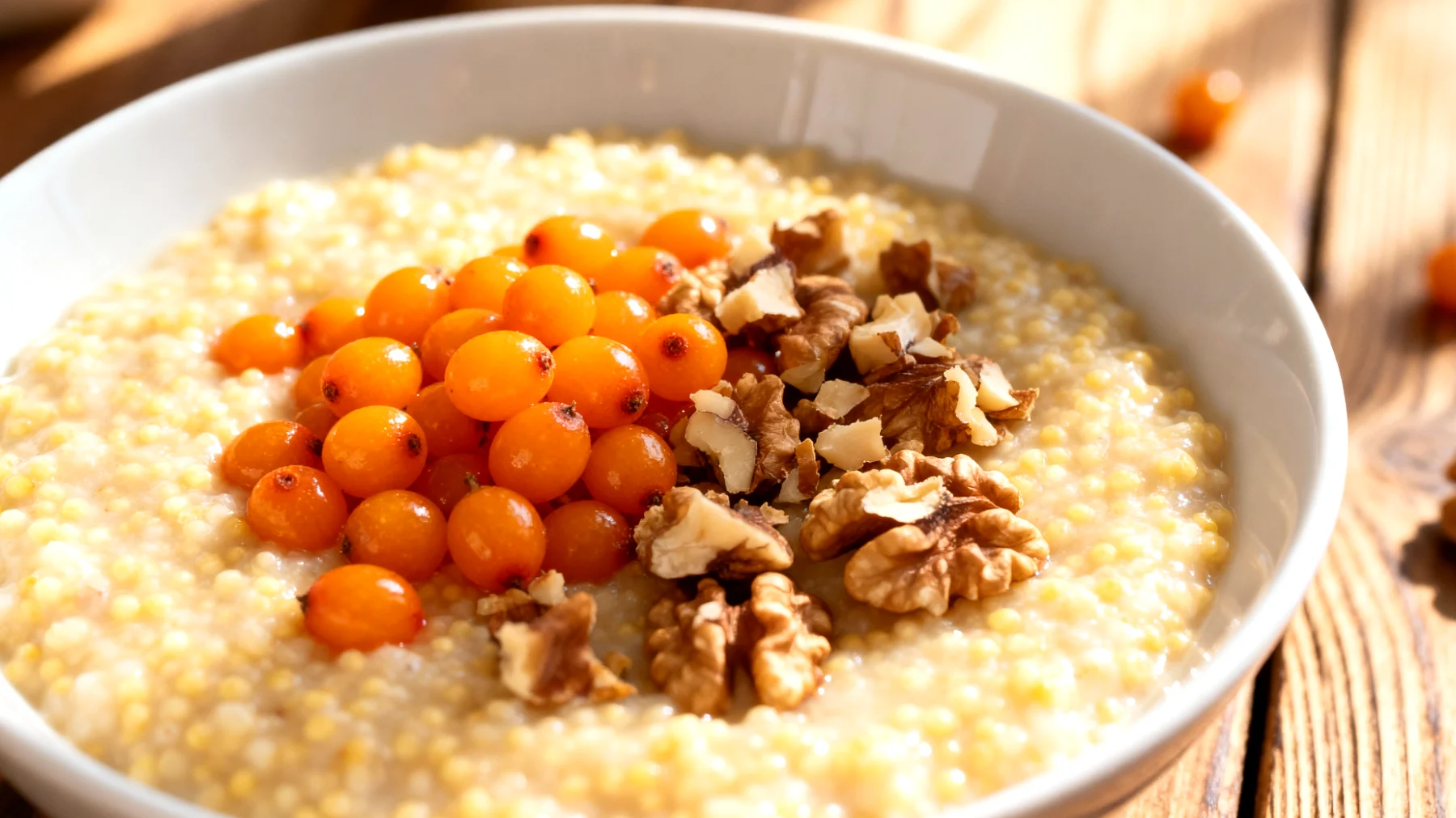 Am Morgen kann die Mischung entweder kalt genossen oder kurz erwärmt werden. Die Sanddornbeeren – frisch, gefroren oder als Saft – sowie die grob gehackten Walnüsse werden erst unmittelbar vor dem Verzehr hinzugefügt. So bleiben die wertvollen Vitamine und ungesättigten Fettsäuren optimal erhalten. Für eine Portion rechnet man etwa 60 Gramm Hirse, eine Handvoll Walnüsse und ein bis zwei Esslöffel Sanddornbeeren.